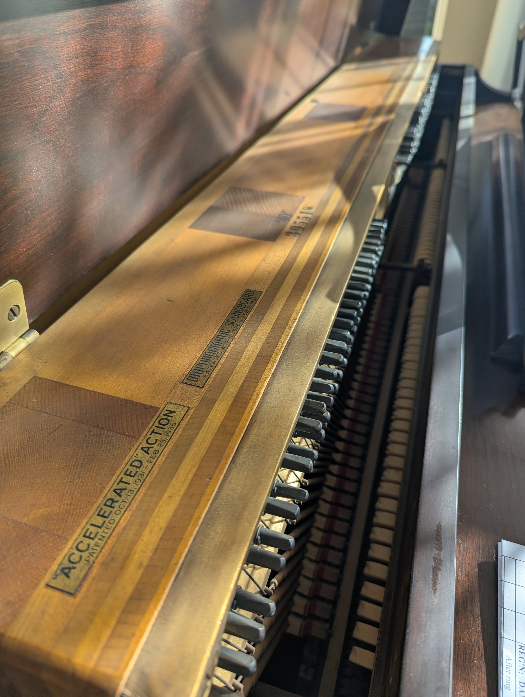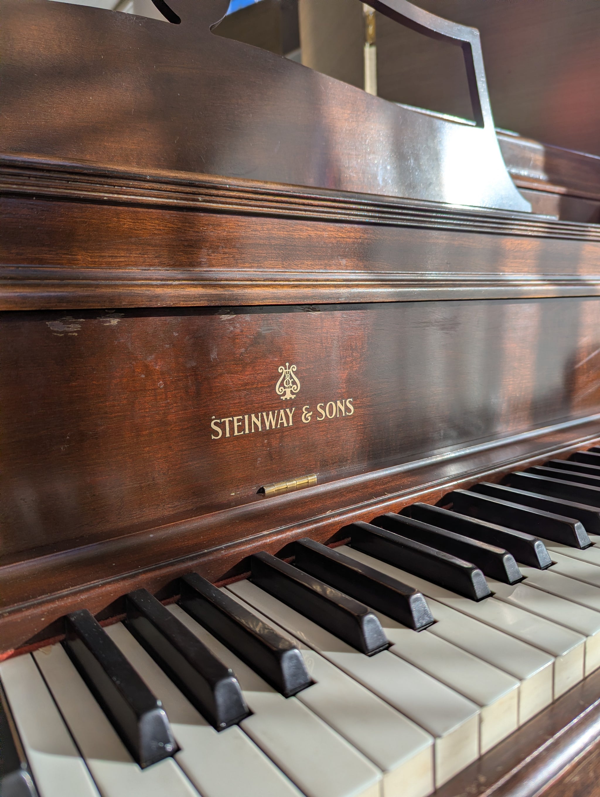Built in 1941. Mahogany satin finish. Steinway uprights are still made using over one hundred patented processes and features to ensure a superior quality of sound.