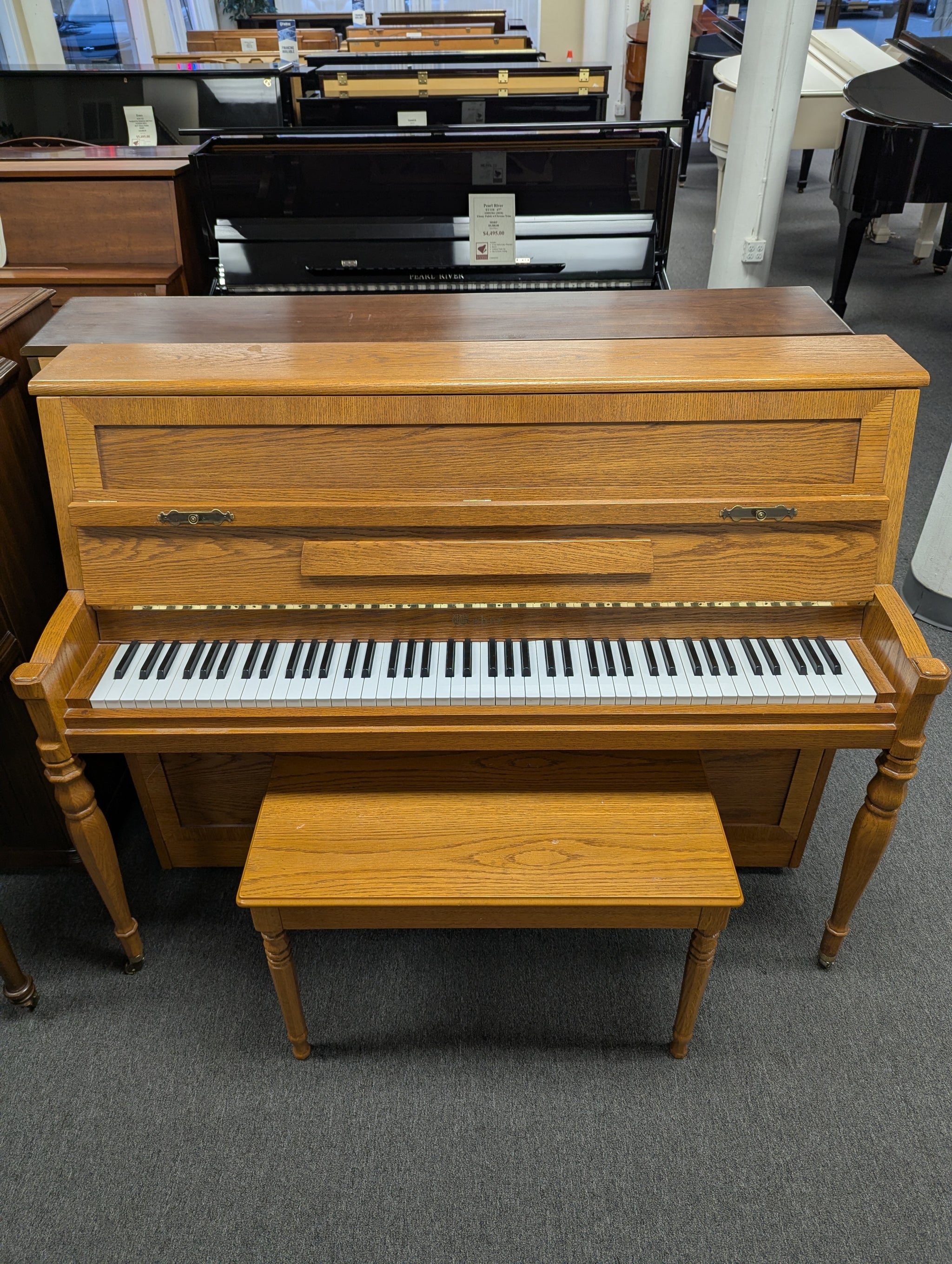 Oak Satin finish. This 43'' piano is the perfect size for the smaller room. A great "1st piano" for the budding pianist. Light touch so it's fun to play.